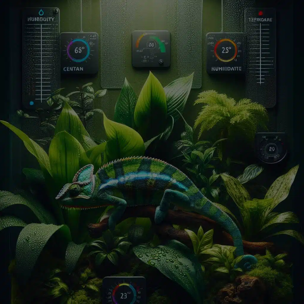 Achieving and maintaining the right humidity level in a chameleon’s enclosure involves attention to water, heat, temperature, light, and substrate.
